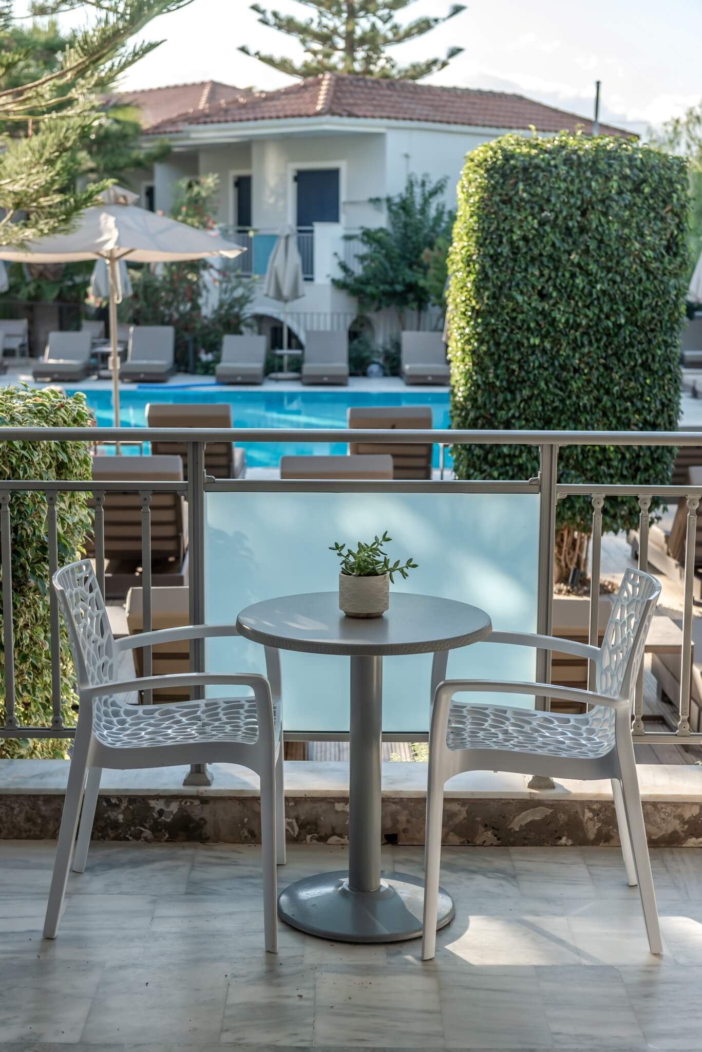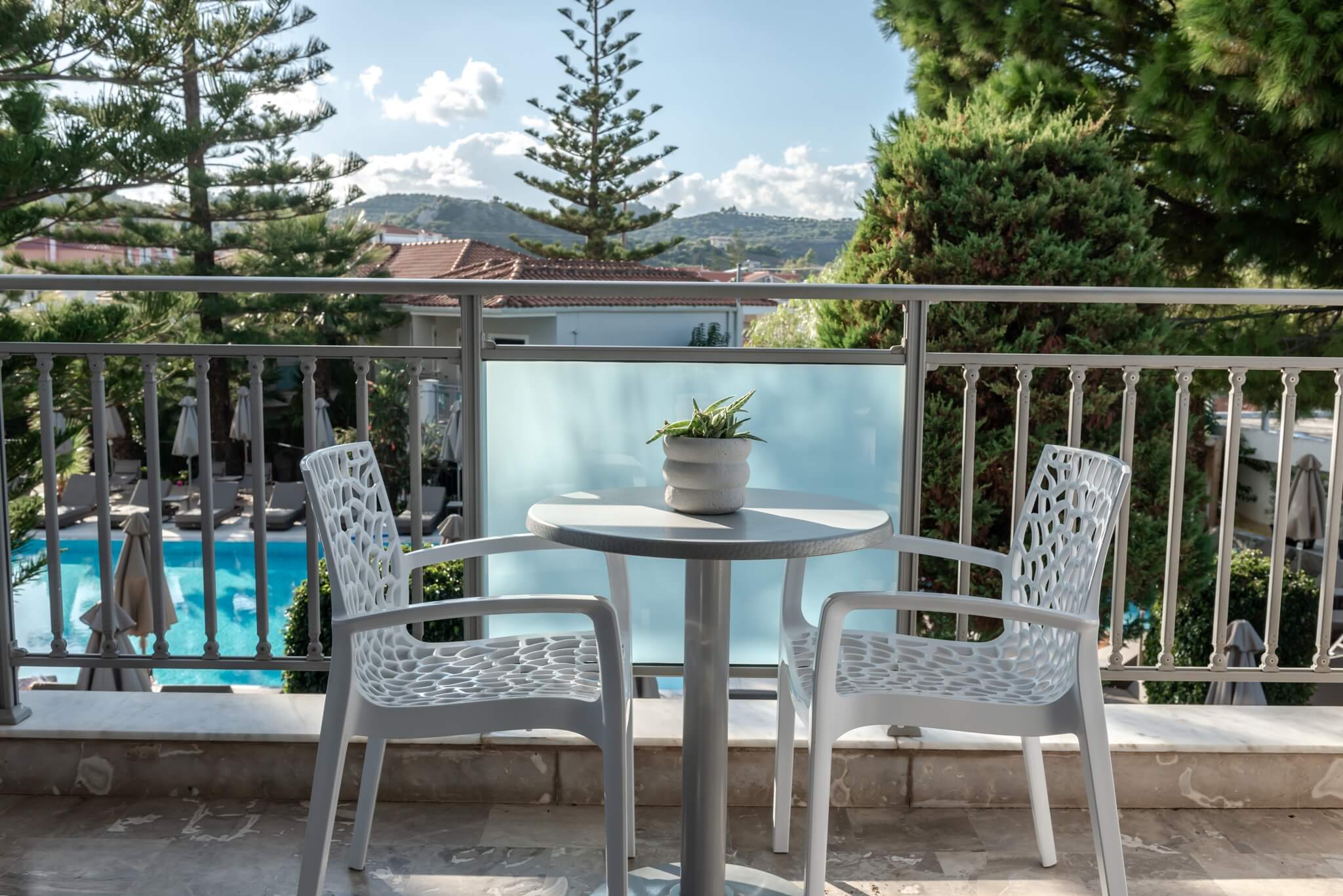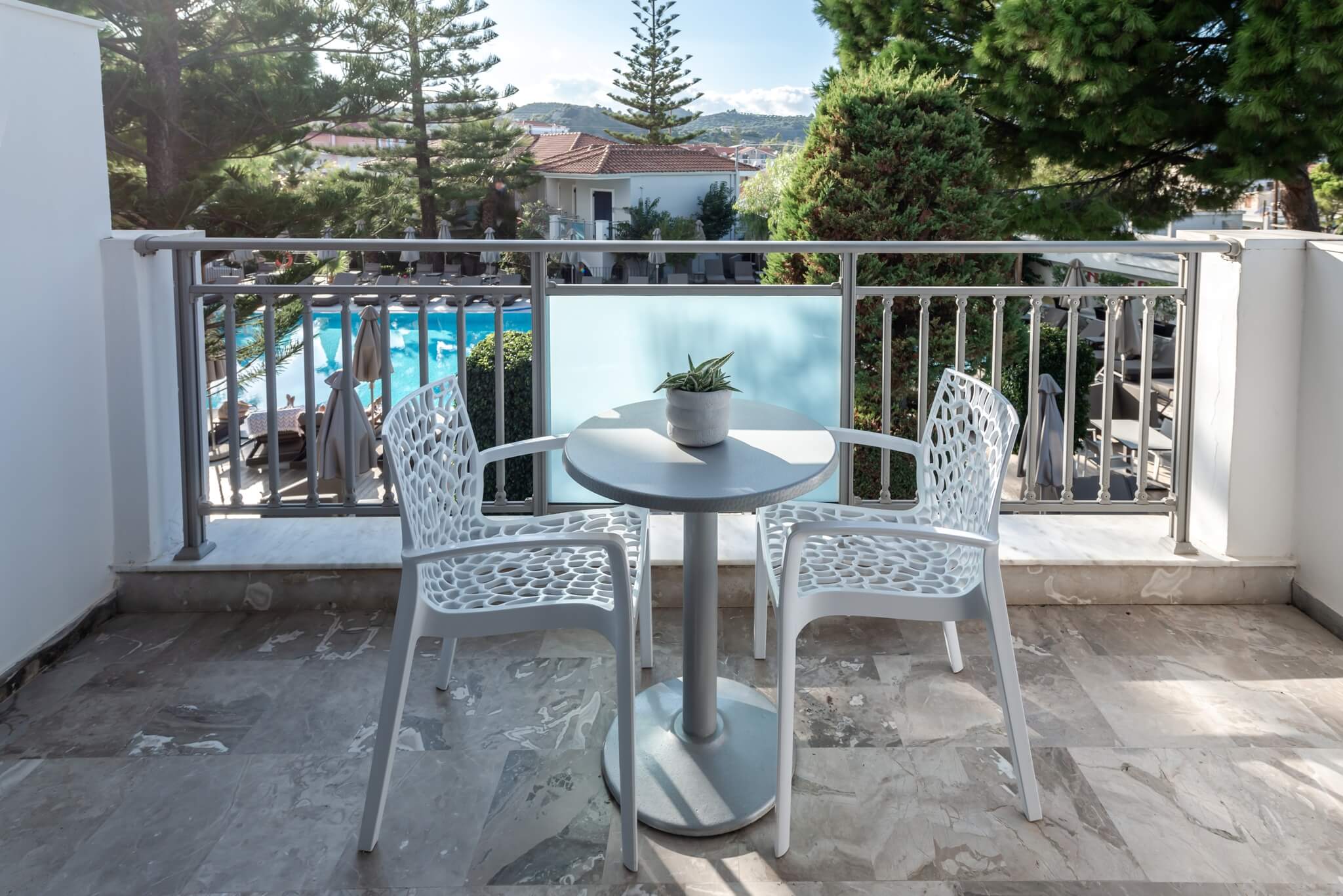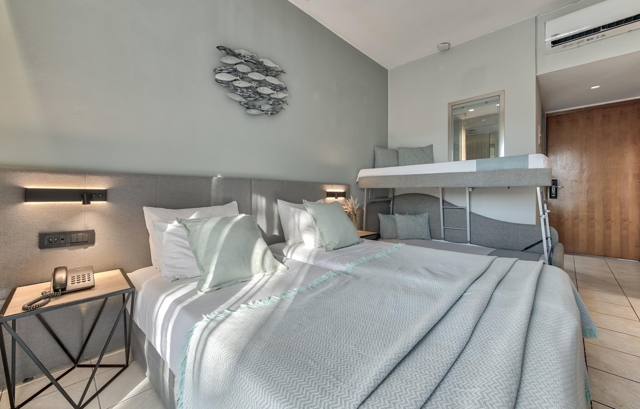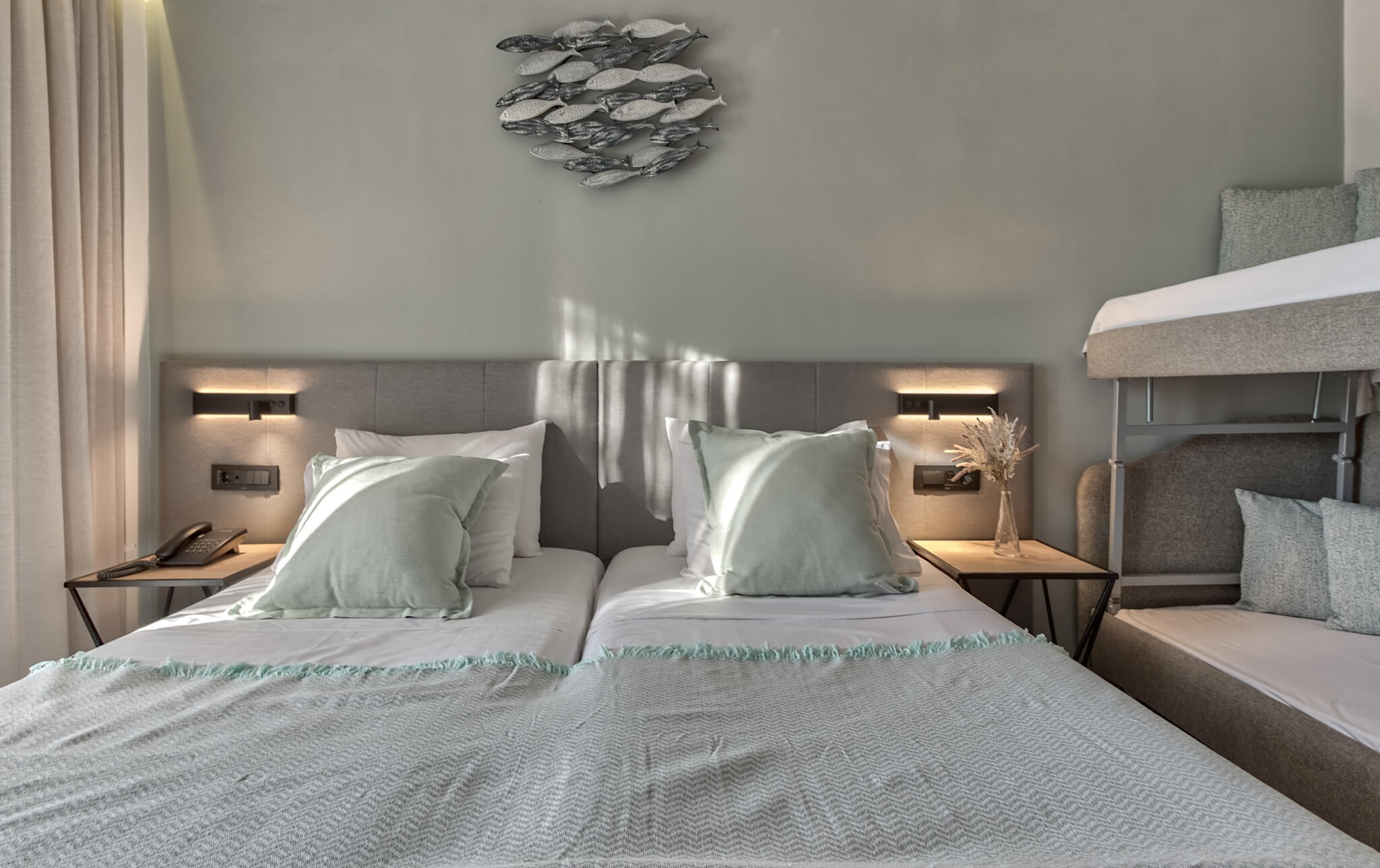 The Premium Quad Pool View rooms of Contessa hotel have a double bed or 2 single beds (upon availability or request) and a bunk bed for children that have mattresses of 1,70 length to 0,70 width. They are about 20 square meters and they all have their own private bathroom with shower and a private balcony with a view of the pool. They are completely refurbished and decorated with modern handmade furniture that enhance a tranquil aura. All rooms feature modern amenities such as mini fridge, safe deposit box, air conditioning, wireless internet, TV.