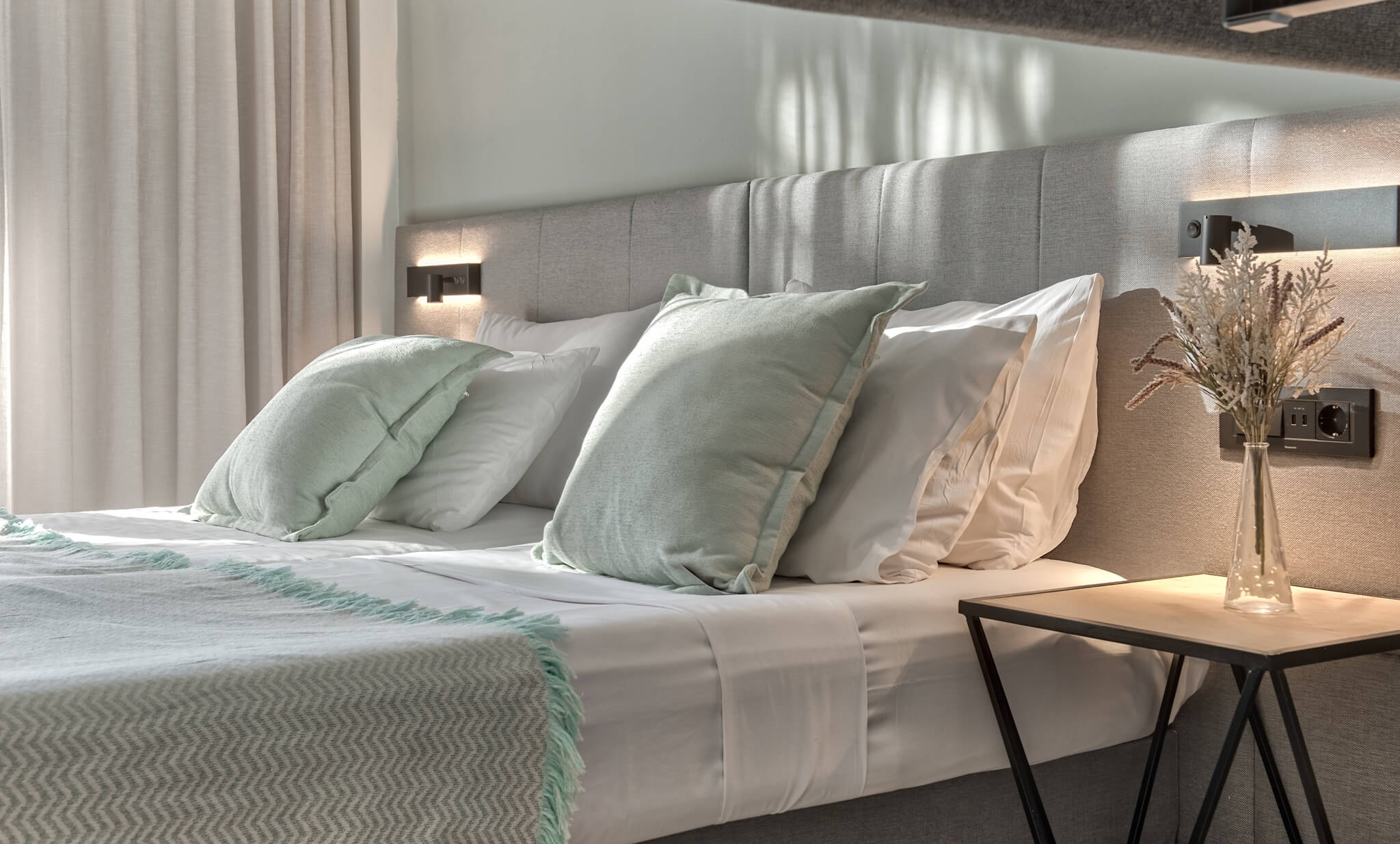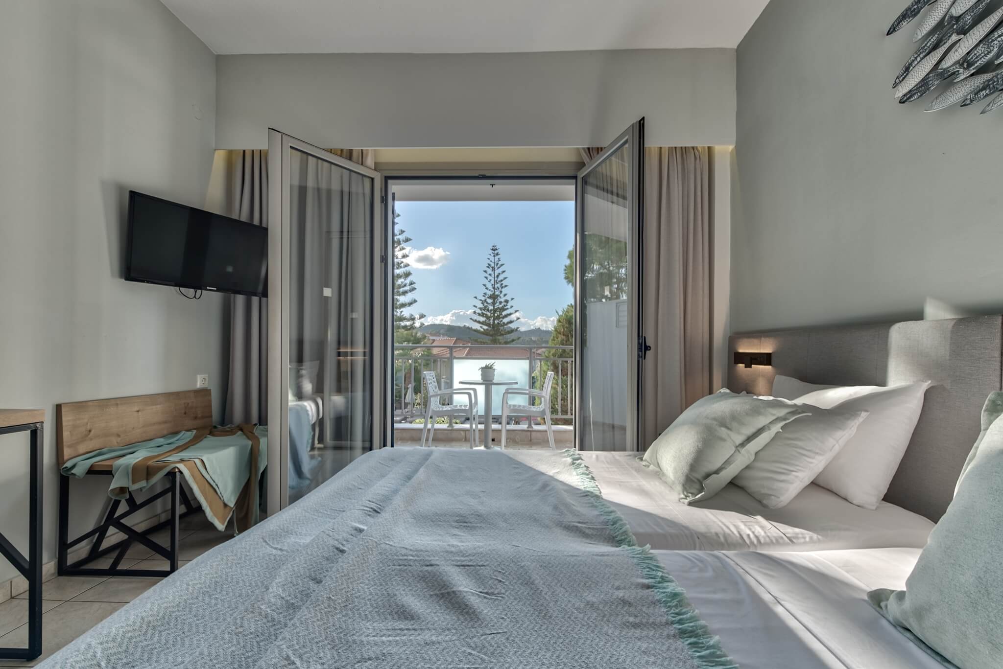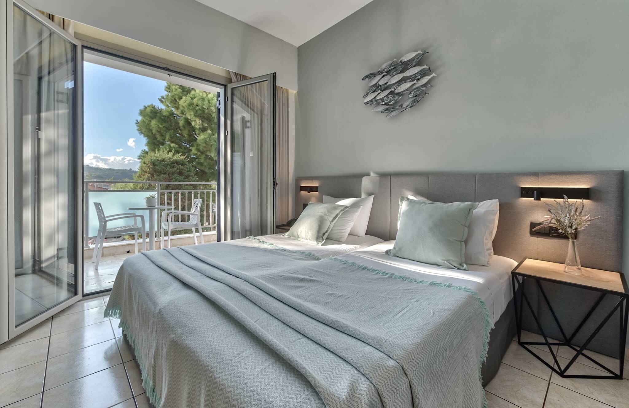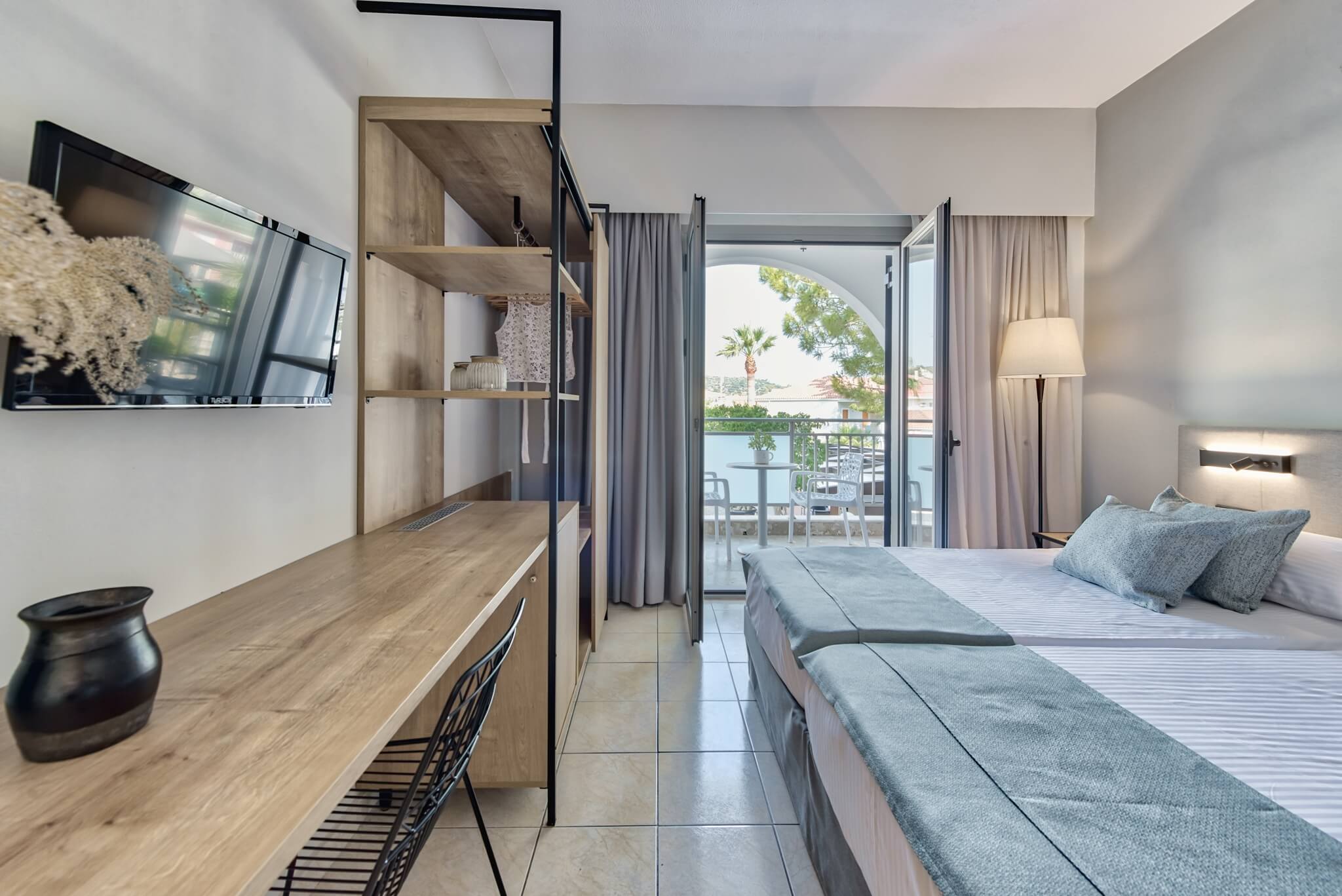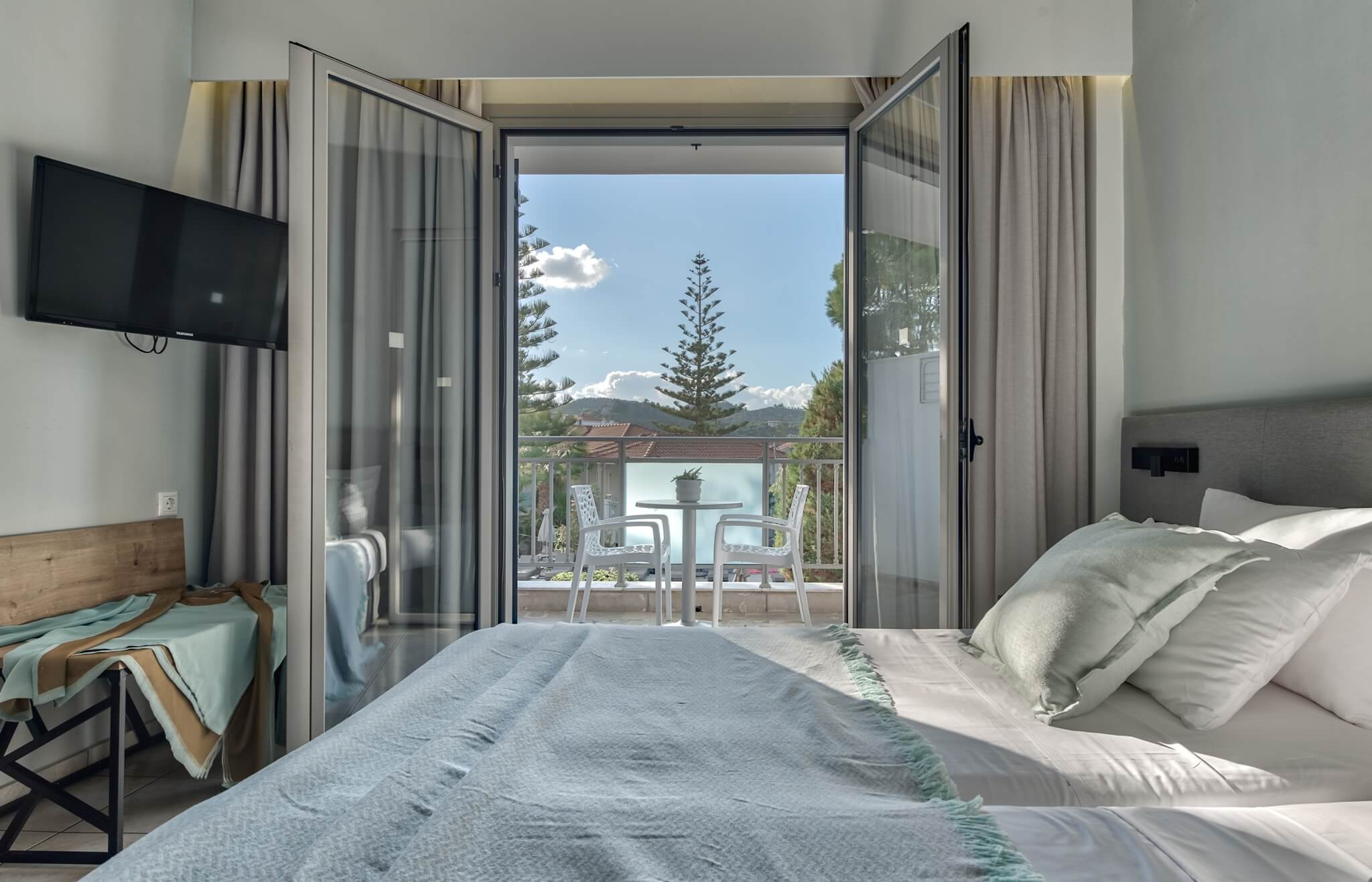 The Premium Quad Pool View rooms of Contessa hotel have a double bed or 2 single beds (upon availability or request) and a bunk bed for children that have mattresses of 1,70 length to 0,70 width. They are about 20 square meters and they all have their own private bathroom with shower and a private balcony with a view of the pool. They are completely refurbished and decorated with modern handmade furniture that enhance a tranquil aura. All rooms feature modern amenities such as mini fridge, safe deposit box, air conditioning, wireless internet, TV.