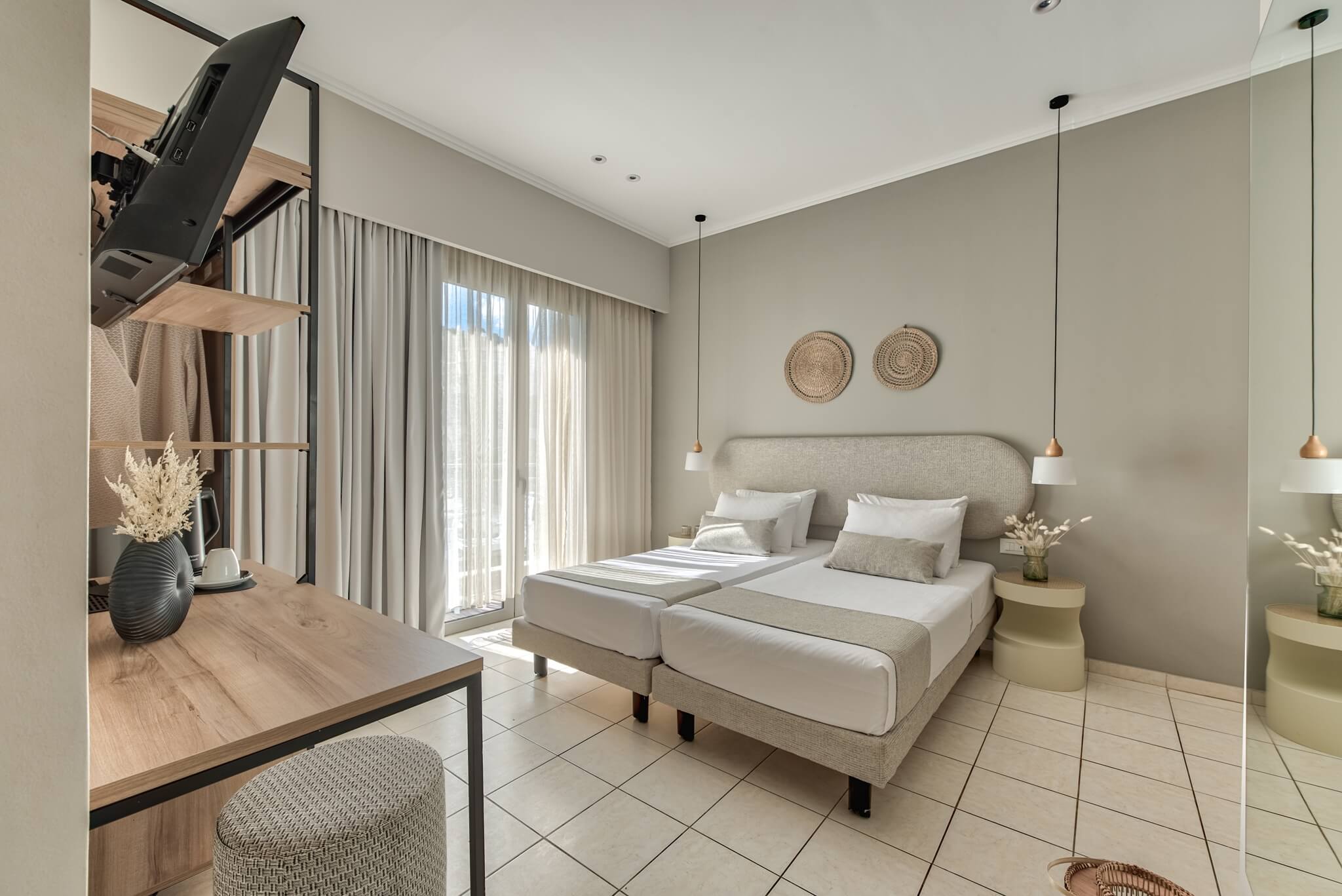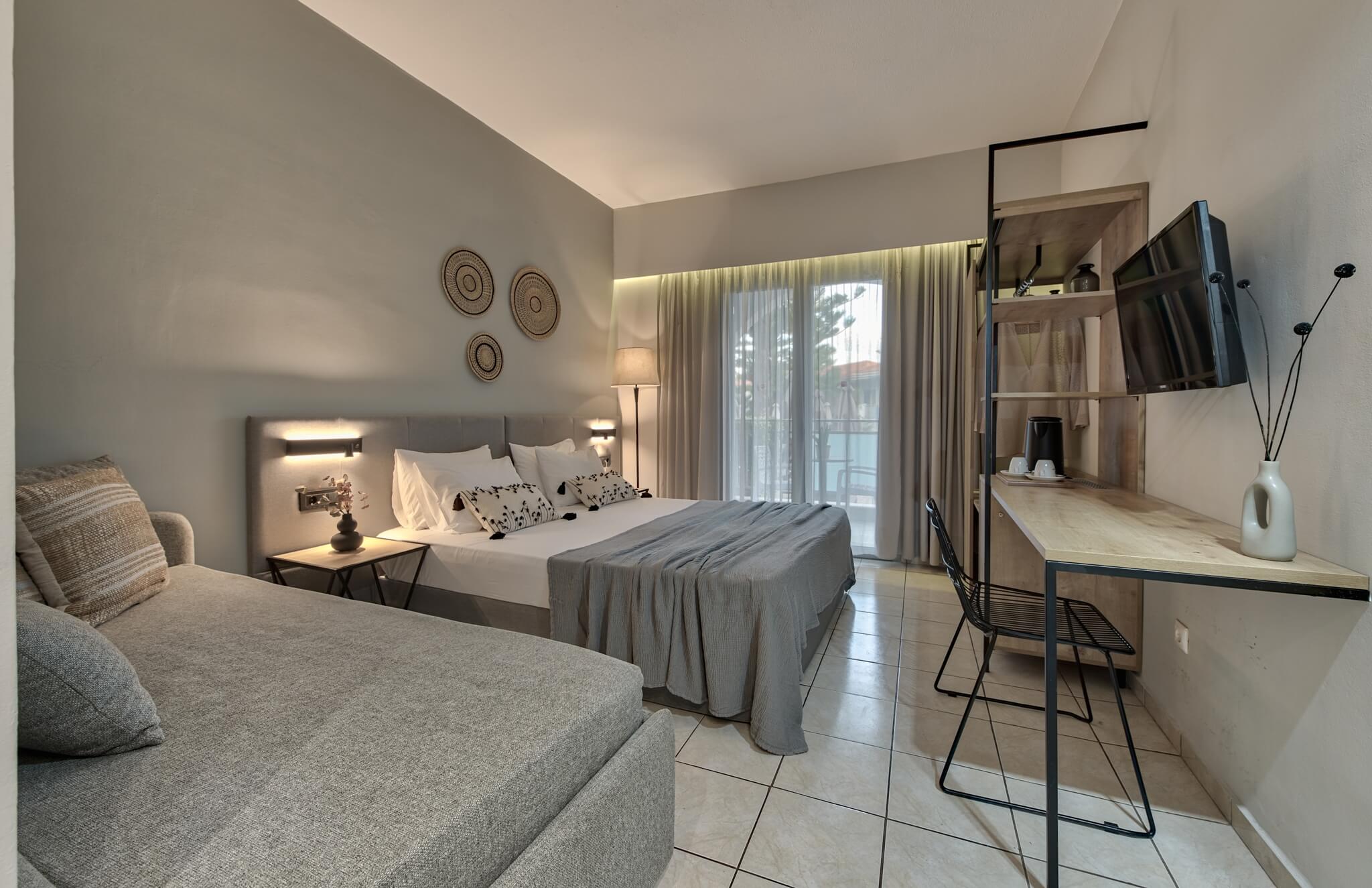 The Premium Triple rooms are around 20 square meters and have a wonderful view of the pool. The rooms are completely refurbished. They can host up to 3 people and the rooms offer 1 double bed or 2 single beds(upon request) as well as a folding bed with a normal mattress. All rooms feature modern amenities (mini fridge, air conditioning, wireless internet, TV, safe deposit box, toiletries) and upper mattresses at all the beds to ensure ultimate relaxation.