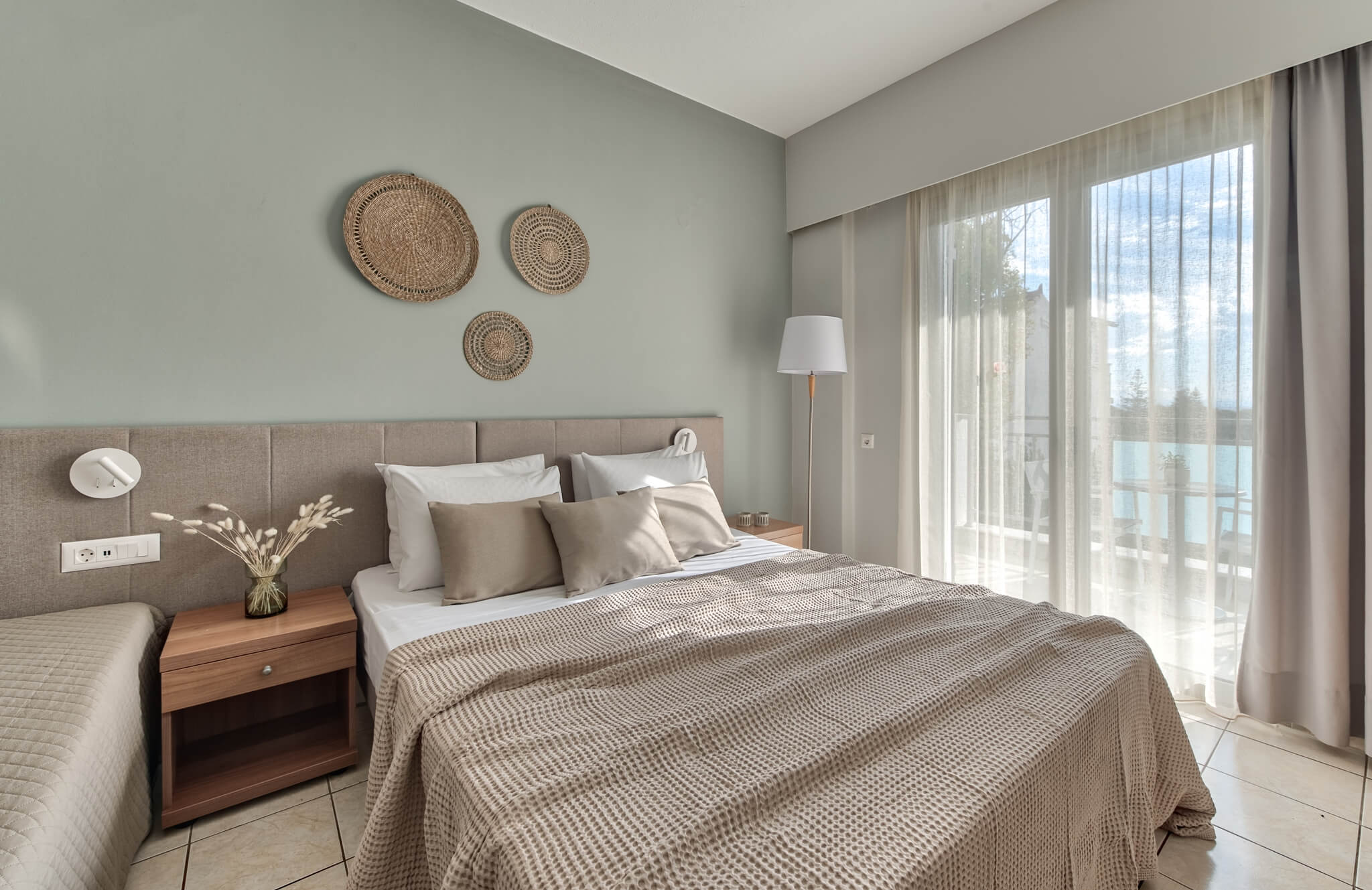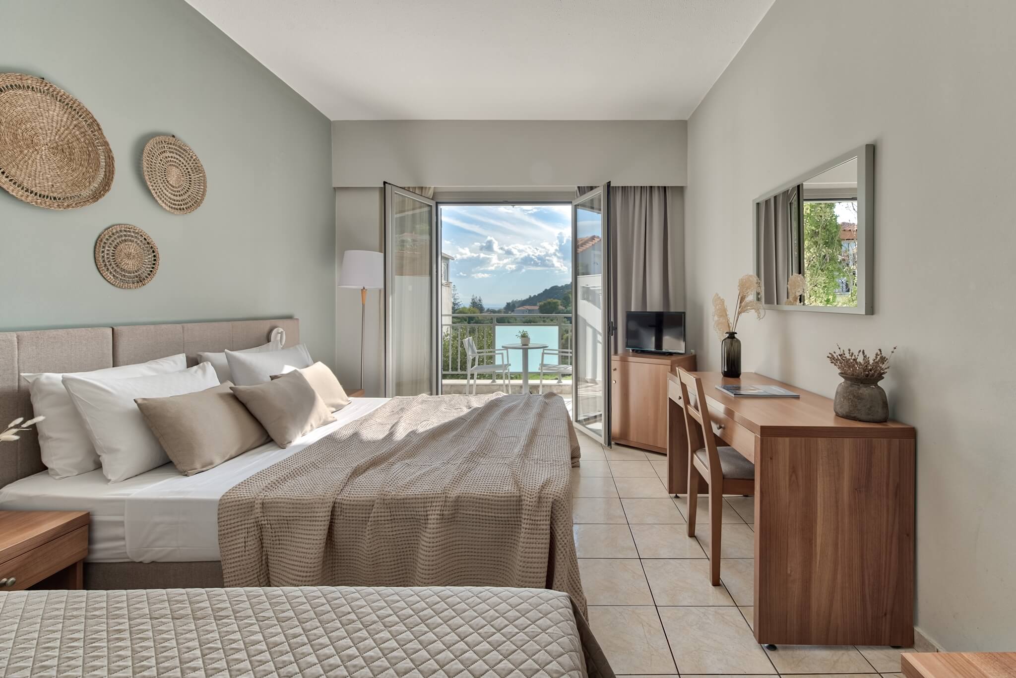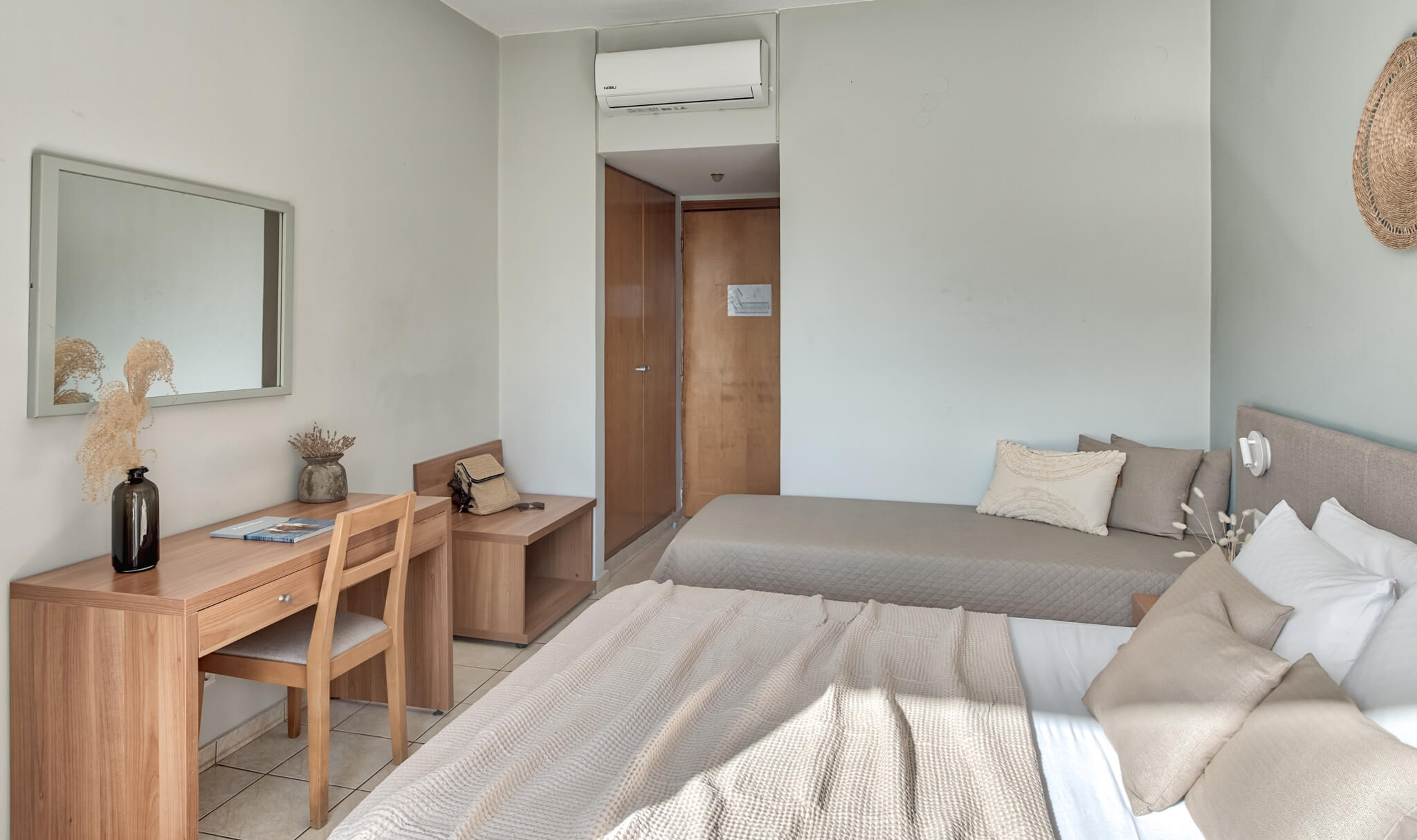 The Standard triple rooms are around 20 square meters and have a view of the mountain or the garden. They can host up to 3 people and the rooms offer 1 double bed or 2 single beds(upon request) as well as a folding bed with a normal mattress. All rooms feature modern amenities (mini fridge, air conditioning, wireless internet, TV, safe deposit box, toiletries) and upper mattresses at all the beds to ensure ultimate relaxation.