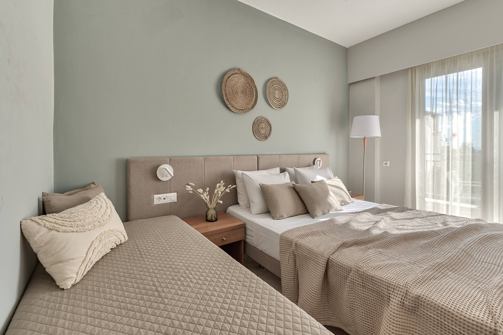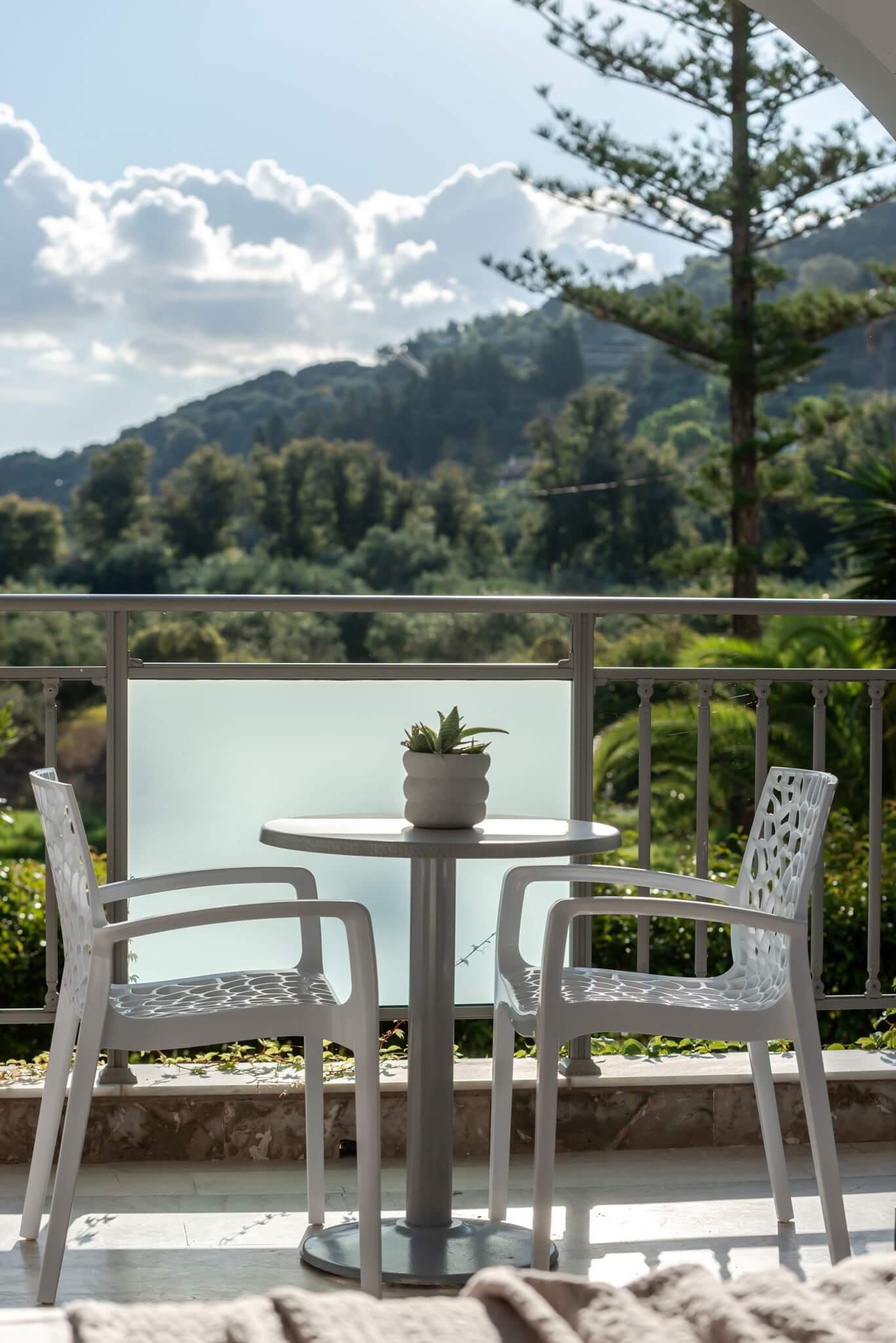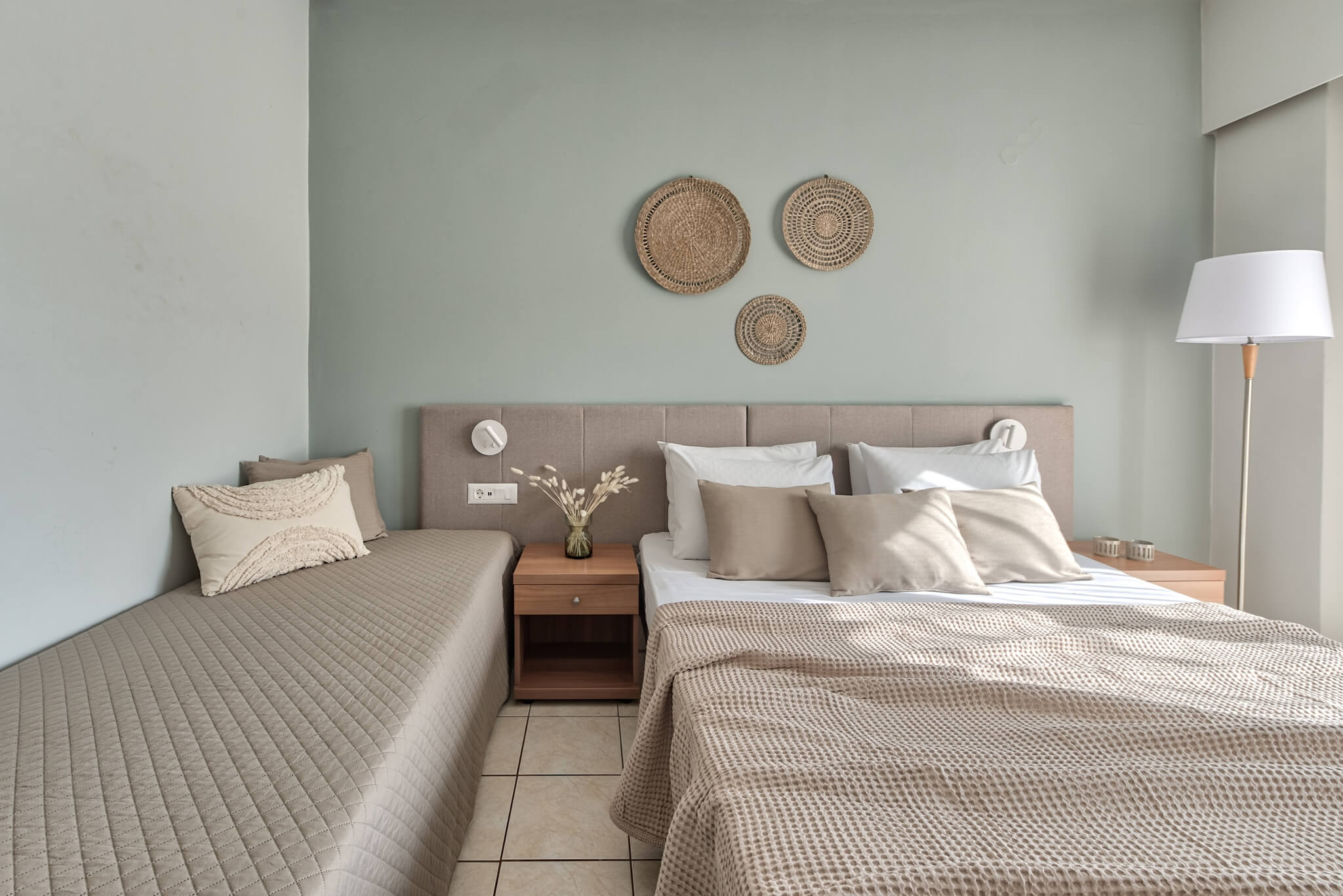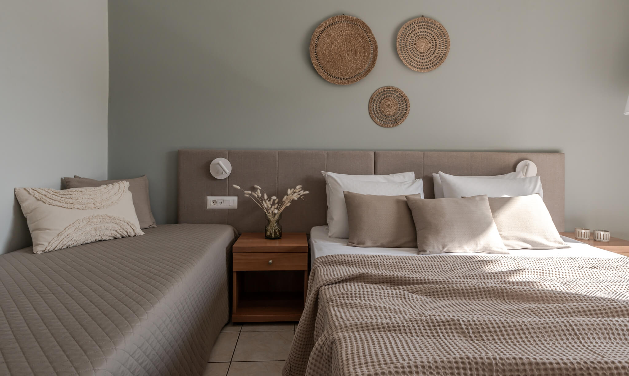 The Standard triple rooms are around 20 square meters and have a view of the mountain or the garden. They can host up to 3 people and the rooms offer 1 double bed or 2 single beds(upon request) as well as a folding bed with a normal mattress. All rooms feature modern amenities (mini fridge, air conditioning, wireless internet, TV, safe deposit box, toiletries) and upper mattresses at all the beds to ensure ultimate relaxation.